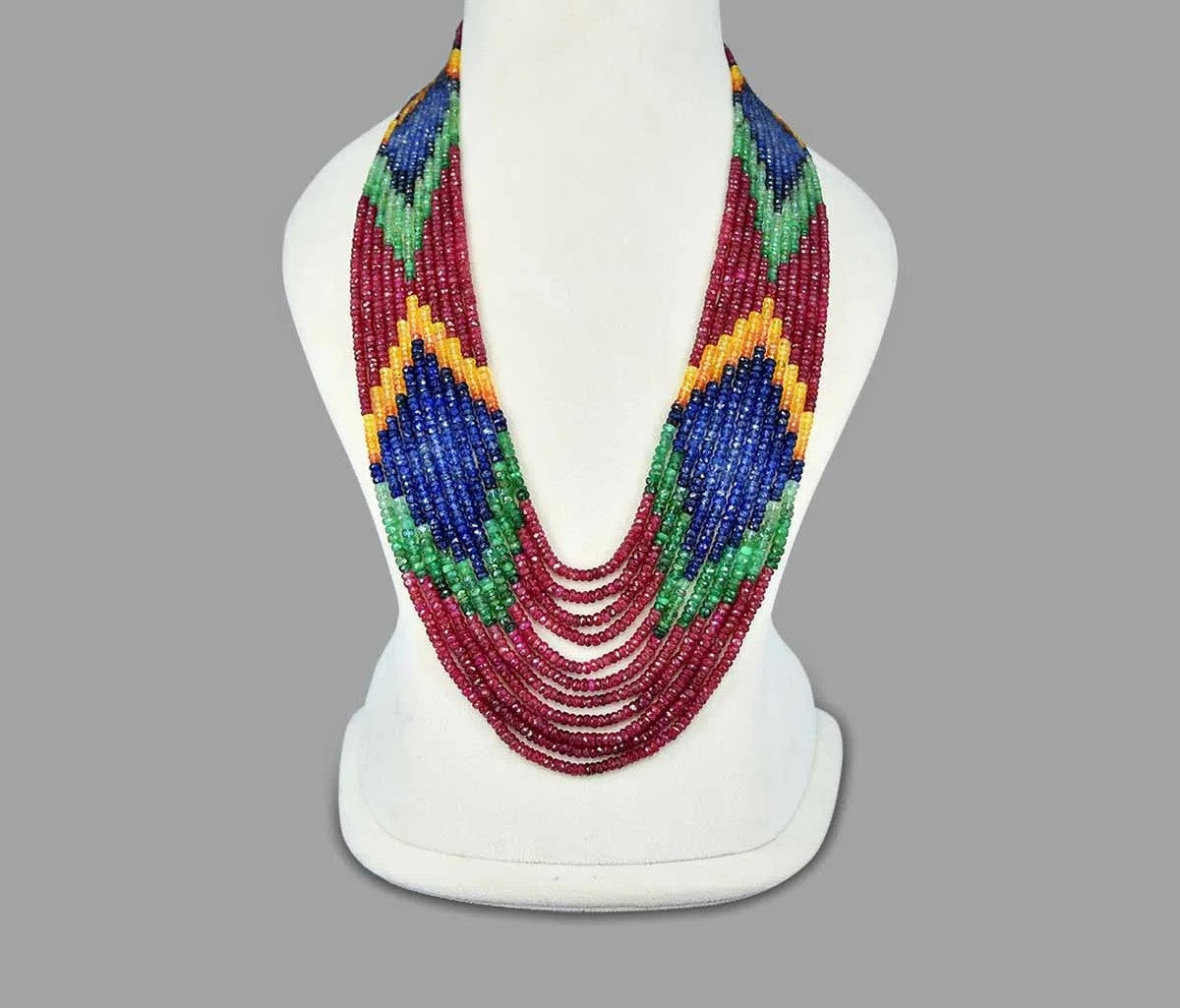 Make an unforgettable style statement with this Natural Rainbow Multi Sapphire Inspired Beaded Necklace, crafted in an opulent 11-layer mala design. Featuring a vibrant blend of ruby, sapphire blue, and emerald green onyx glass beads, this necklace celebrates color, creativity, and craftsmanship.