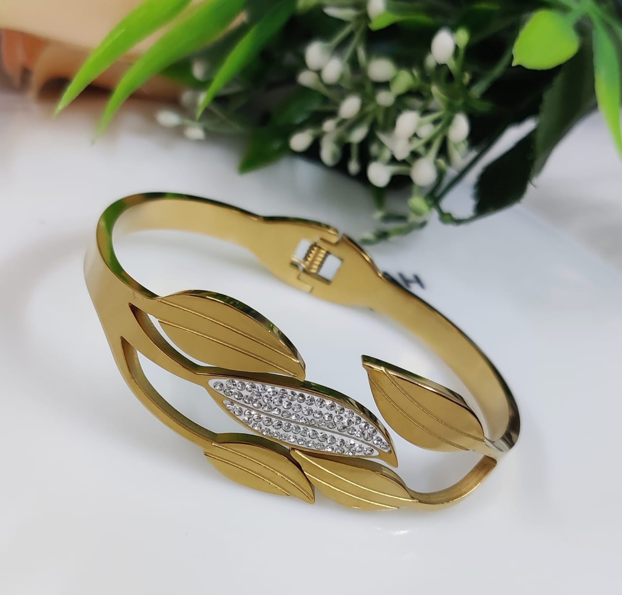 Elevate your style with this Anti-Tarnish Feather Dual Tone Cuff Bracelet from TJC – The Jewelry Creations. Inspired by elegant leaf and feather motifs, this bracelet features a graceful blend of gold and silver tones, enhanced with finely set white American diamonds at the center.