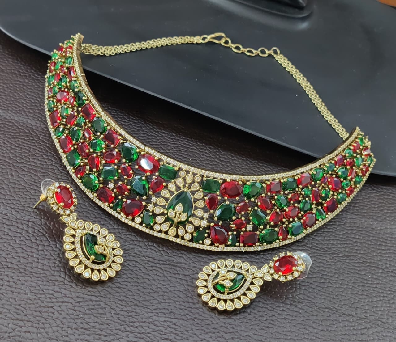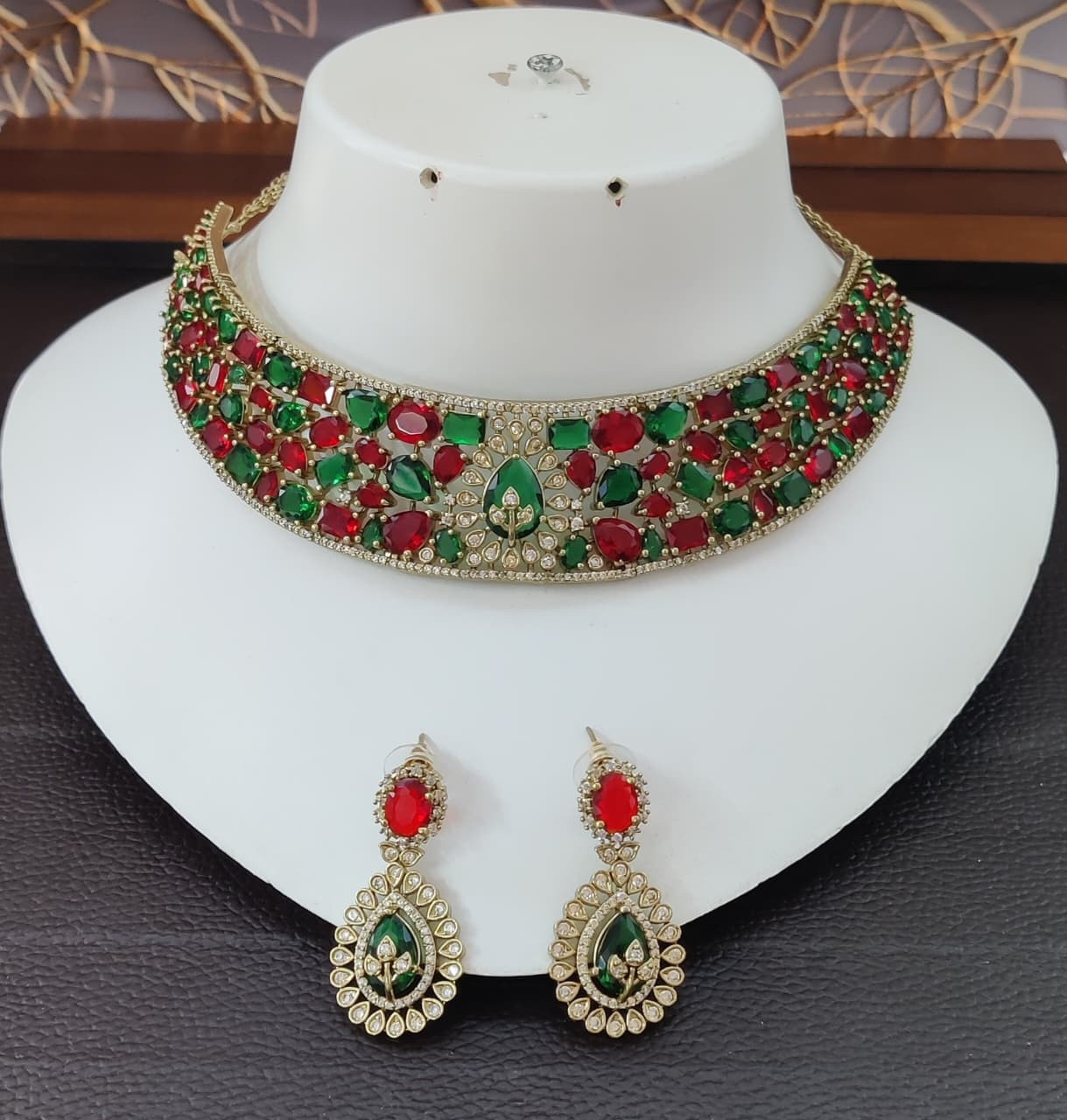 TJC Ruby-Green Mix Bridal Choker Necklace Set with Earrings