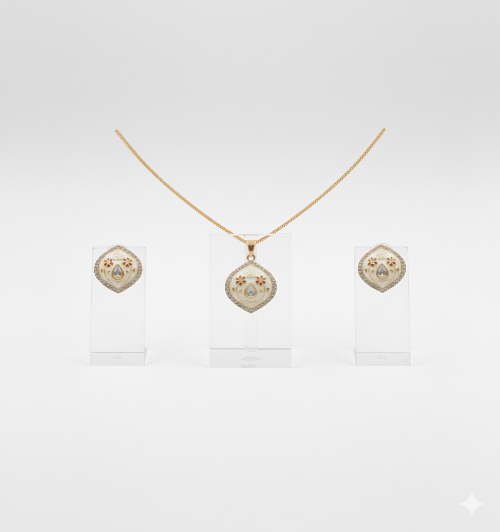 Add a touch of timeless elegance to your jewelry collection with this Italian Enamel Chain Pendant from TJC – The Jewelry Creations. Crafted on a premium brass base, this pendant features Indian Moissanite Glass Polki highlighted with American Diamonds and Cubic Zirconia, giving it a rich, luxurious sparkle.