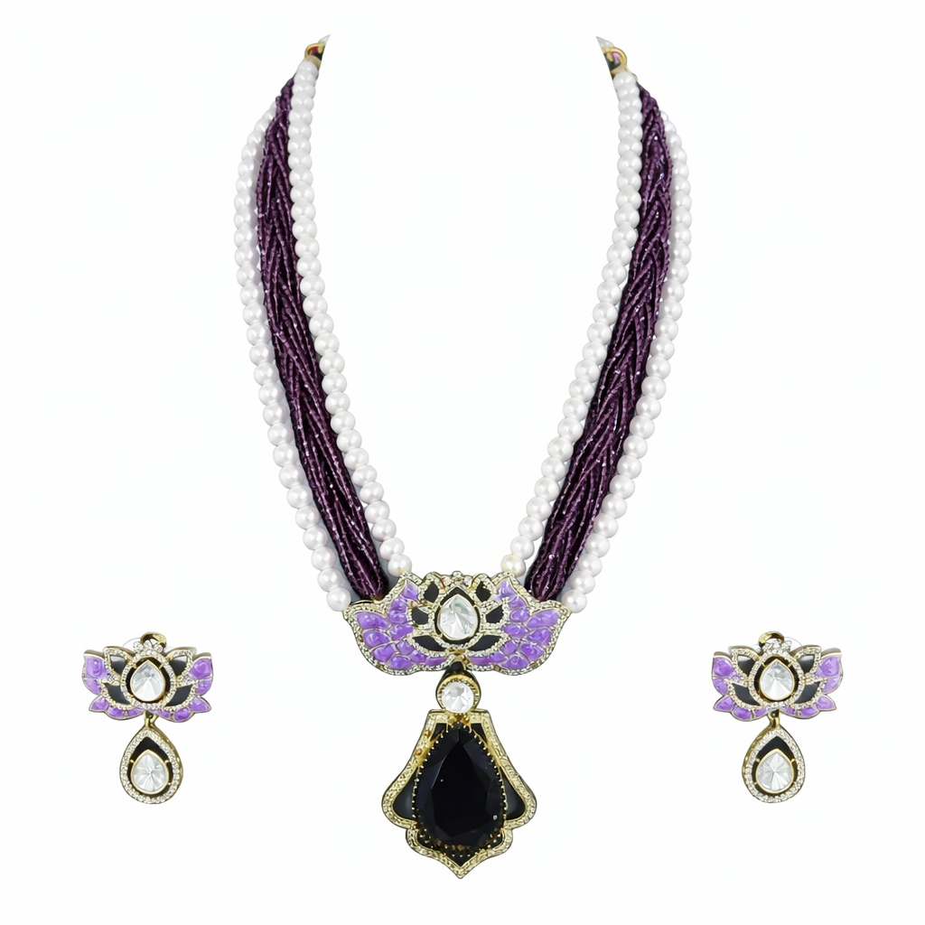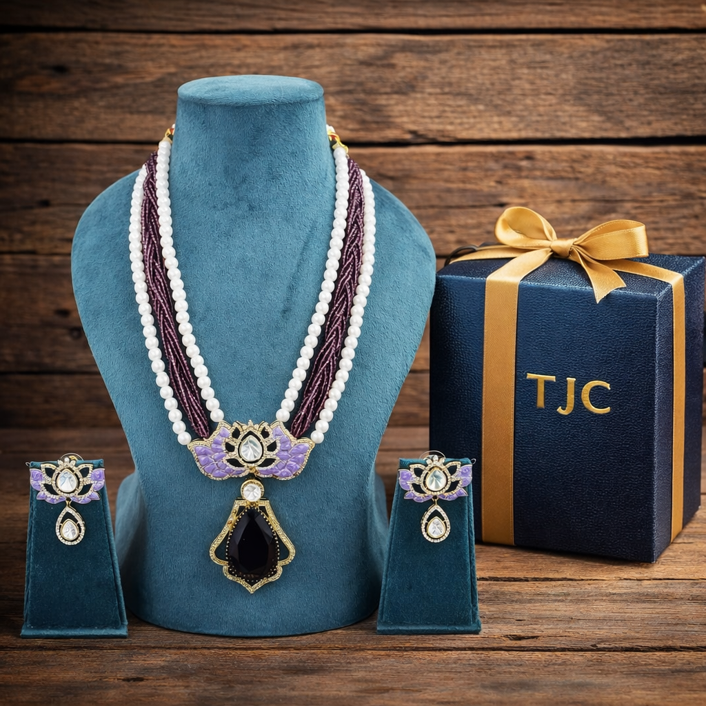 Elevate your ethnic look with this beautifully crafted Indian Traditional Necklace Set from TJC – The Jewelry Creations. Designed with stunning pear-shaped Indian doublet glass stones, highlighted by white moissanite polki, and finished with hydro beads and Indian glass pearls, this necklace reflects timeless elegance.