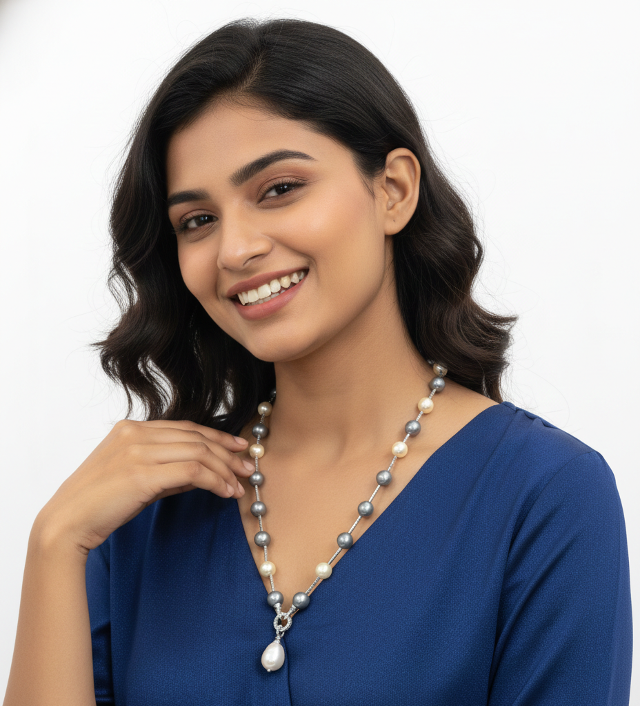 Elevate your everyday and festive looks with this elegant Mother of Pearl beaded necklace. Designed with round Silver & Cream White -toned beads and subtle AD accents, this single-layer mala offers a refined shine and graceful finish. Crafted with a brass base metal and plated for durability, it is lightweight, versatile, and perfect for both ethnic and contemporary styling.