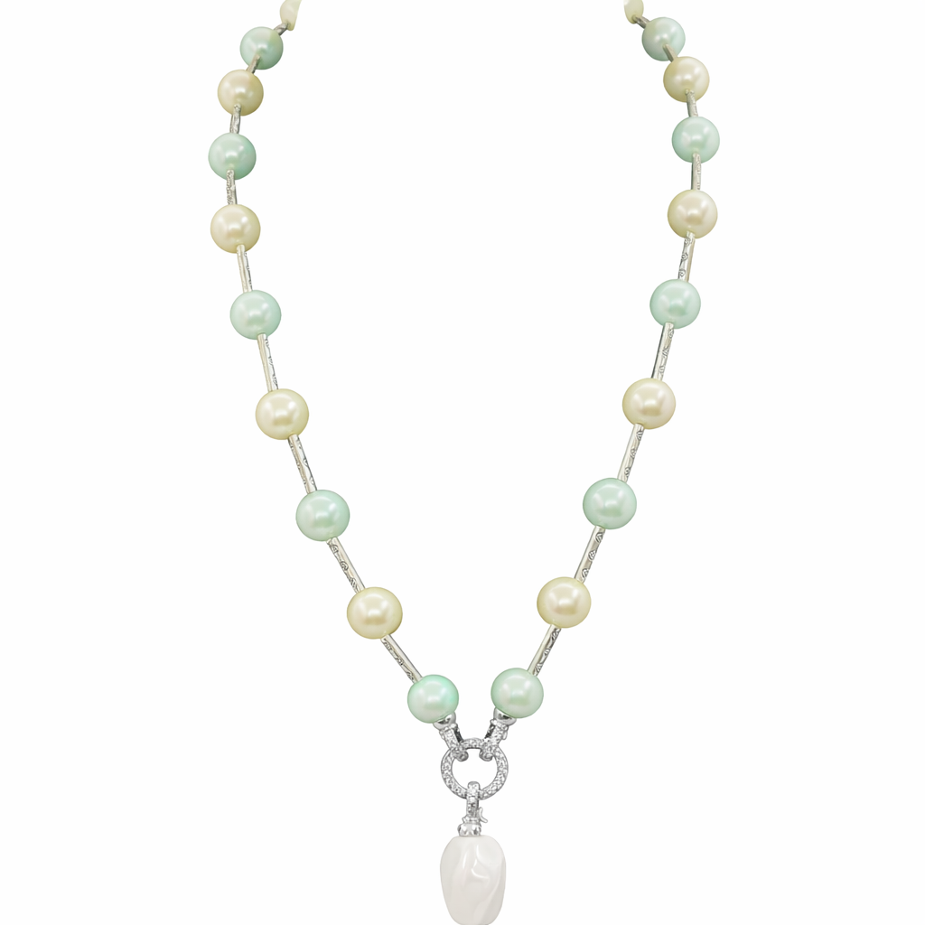 Elevate your everyday and festive looks with this elegant Mother of Pearl beaded necklace. Designed with round Light Green & Off White toned beads and subtle AD accents, this single-layer mala offers a refined shine and graceful finish. Crafted with a brass base metal and plated for durability, it is lightweight, versatile, and perfect for both ethnic and contemporary styling.