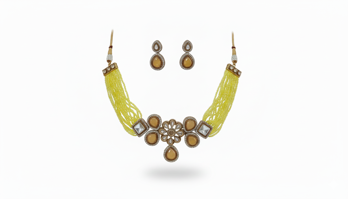 Elevate your ethnic and fusion looks with this Yellow Jasper Inspired Indian Monalisa beaded choker necklace. Designed with 7 graceful layers of finely crafted diamond-cut glass beads, this necklace reflects a luxurious antique charm. The yellow hydro tone paired with Victorian/antique plating creates a bold yet elegant statement—perfect for festive occasions, weddings, and evening wear.